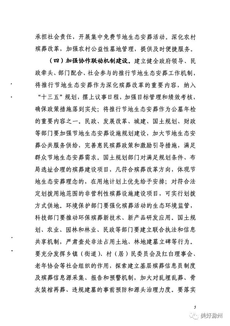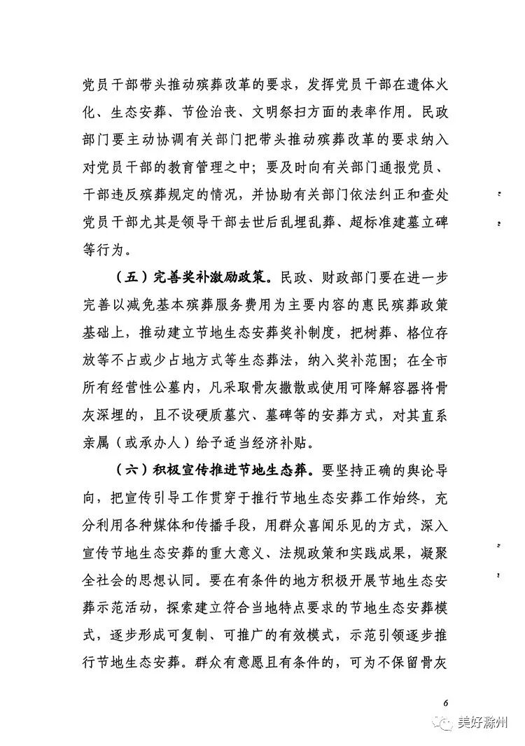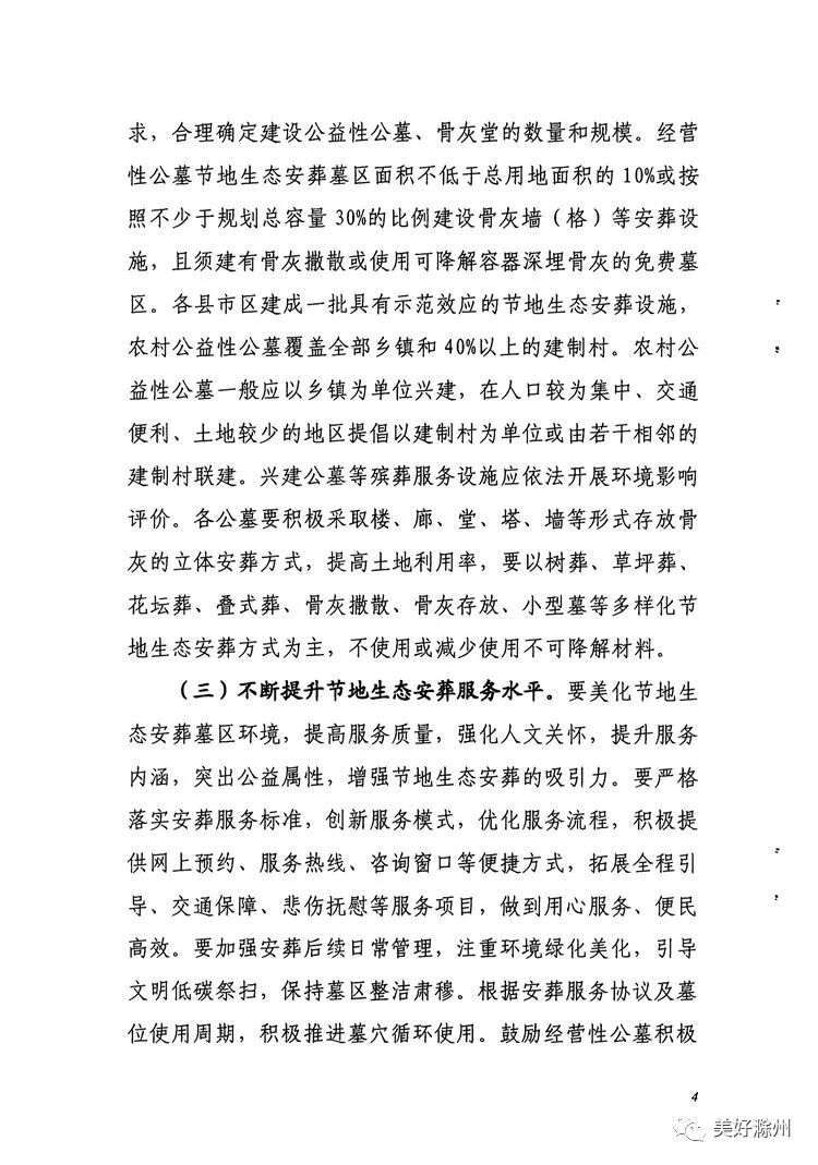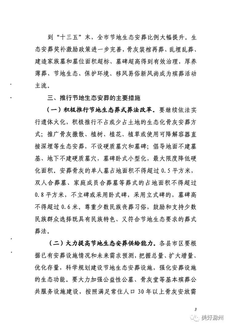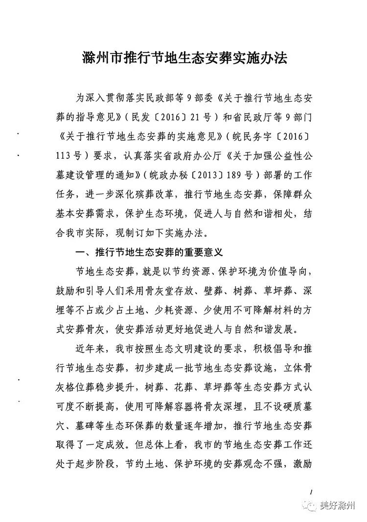 滁州市民政局、国土房产局等九部门联合发布《滁州市推行节地生态安葬实施办法》(以下简称《办法》),实行节地生态葬式葬法改革,推行不占或少占土地的生态化骨灰安葬方式,并提出对符合节地生态葬理念的殡葬建设项目优先安排用地。